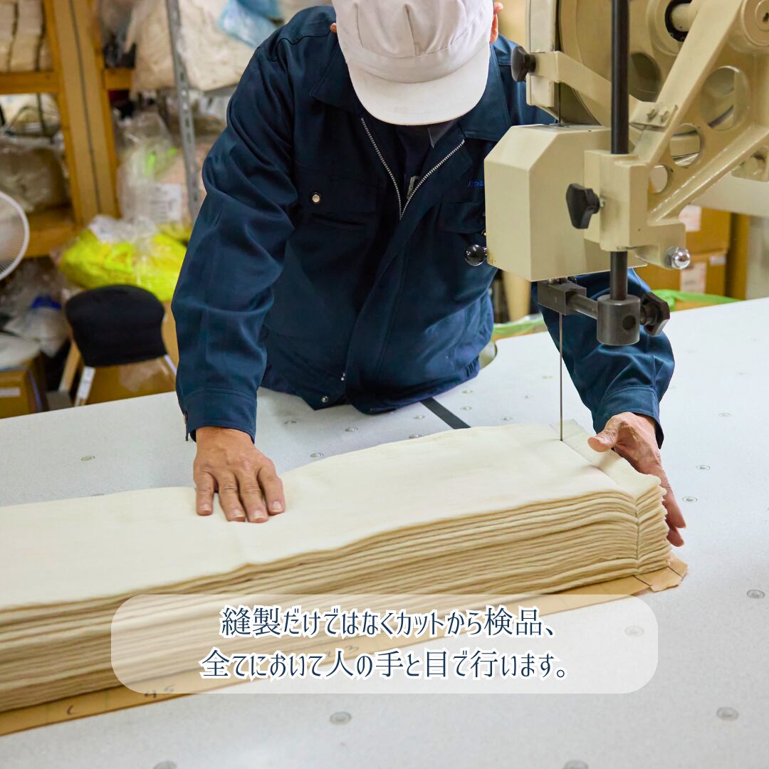 糸から針まで強いこだわりを持った老舗国内工場にお願いしています。裏面の糸切りに至るまで、心を込めて製品をお作りしています。