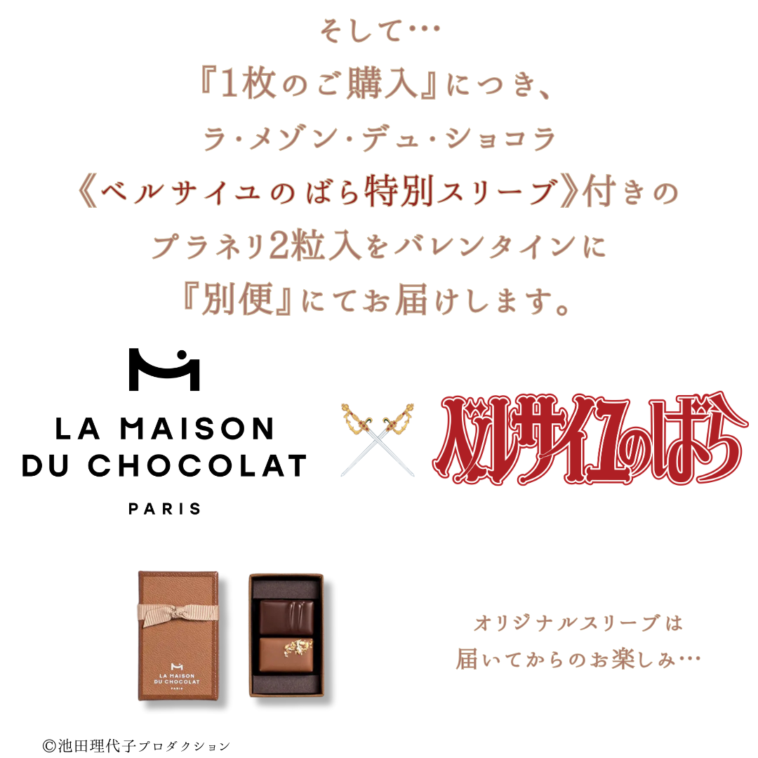 またこの製品には『2.14のバレンタイン』に《ラ・メゾン・デュ・ショコラ》コラボパッケージのショコラとオスカルからの手紙が届く特典がついています。(1枚購入ごとにお届けします。ショコラのみ発送先を変更することはできません)