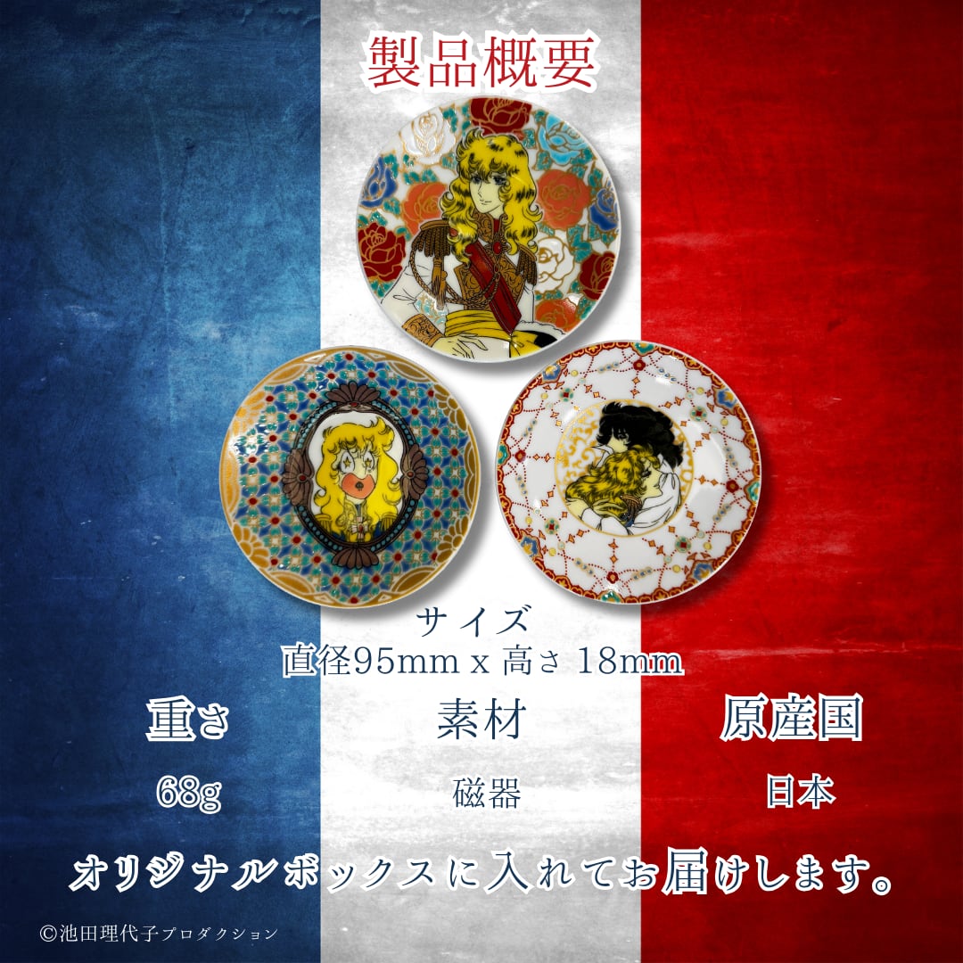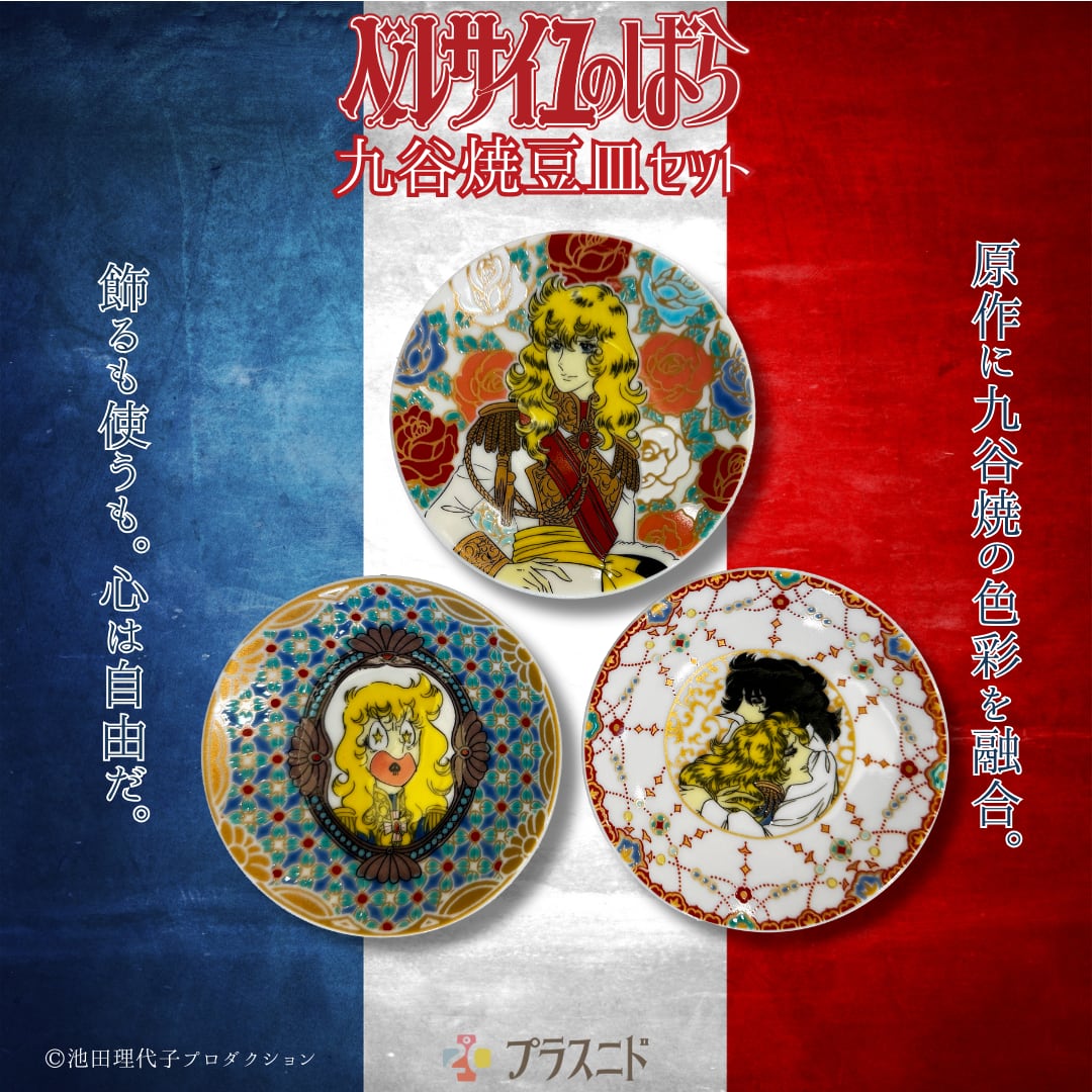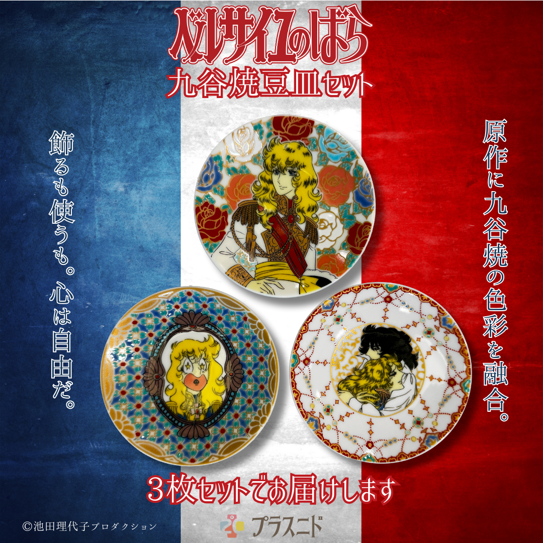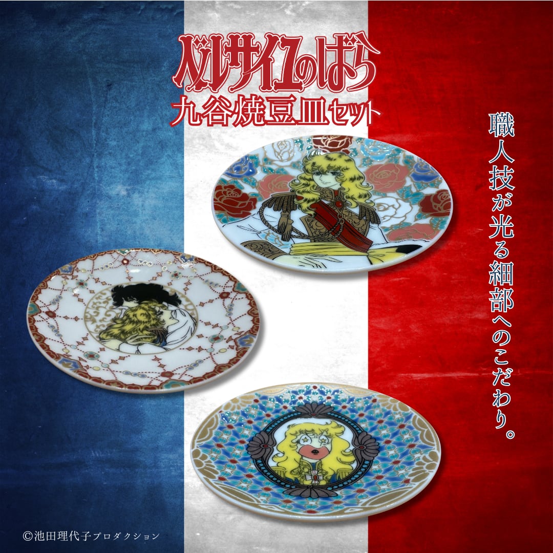 華やかなベルサイユのばらの世界感を九谷焼にて表現した魅力溢れる豆皿3枚セット。熟練の技で作り上げられた九谷焼の美しい色合いと丁寧なデザインは、食卓を華やかに演出します。