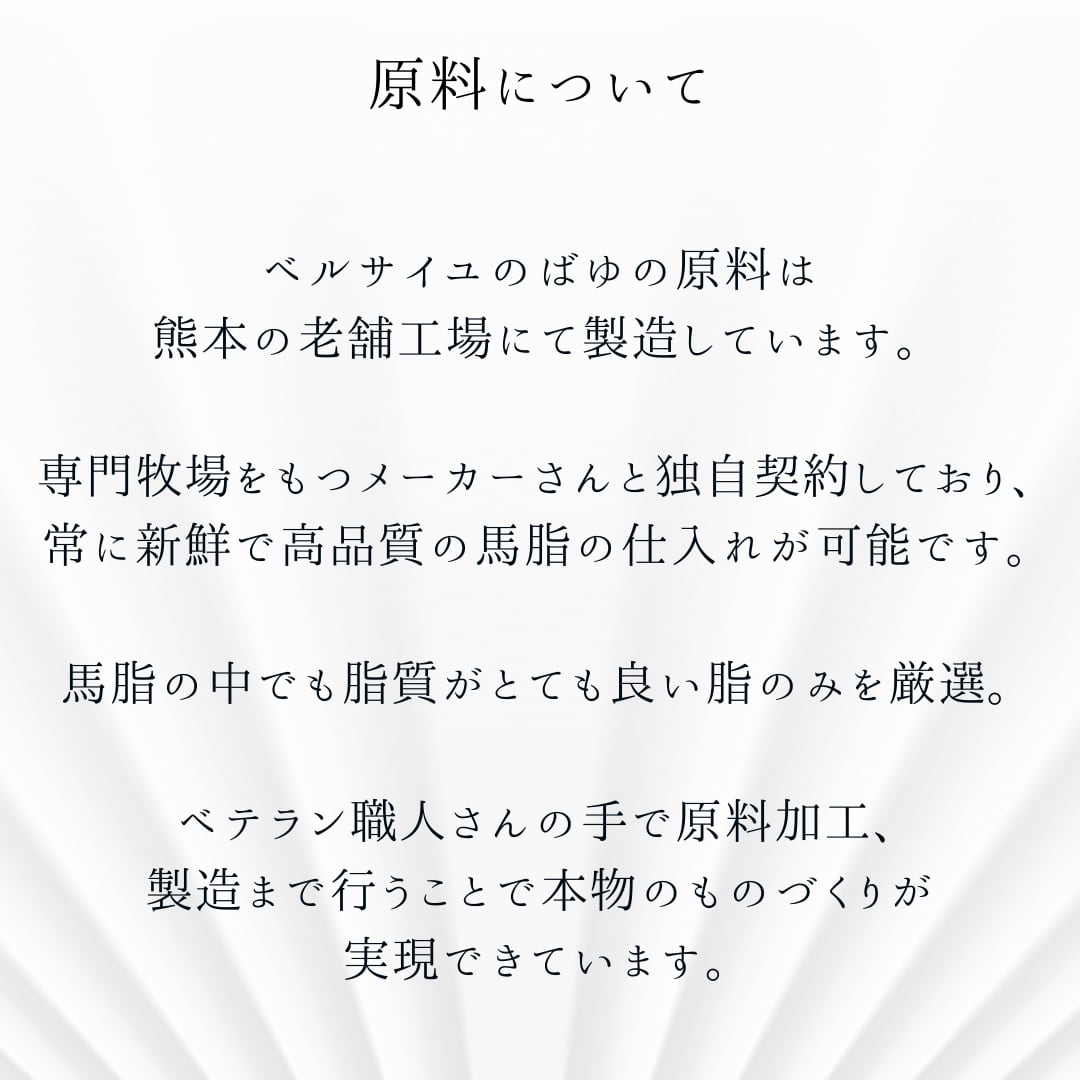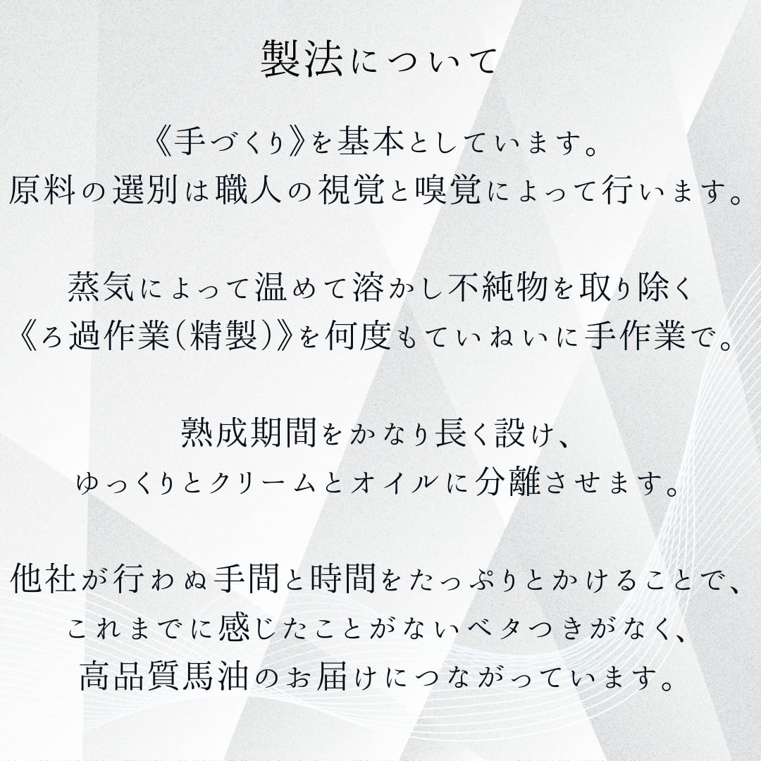 人の皮脂に近い馬油はお肌にしっとりと潤いを与えます。精製を繰り返したことによりべたつきを感じることなく快適にお使いいただけます。
