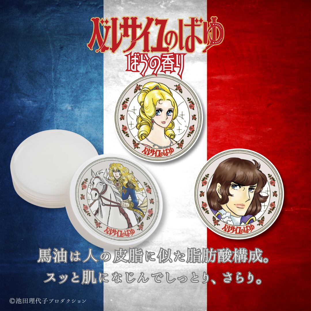 《ベルサイユのばら》ベルサイユのばゆが登場。独特の匂いを抑えるために精製を繰り返し、心穏やかになるばらの精油で香り付け。日本人に合わせたほんのり香る絶妙な調香にて仕上げています。