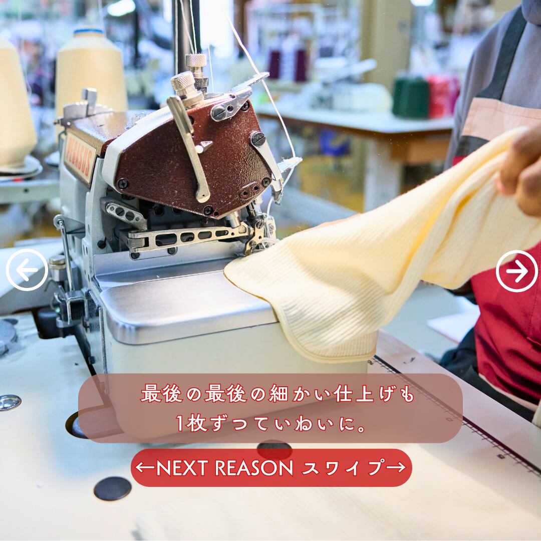 糸から針まで強いこだわりを持った老舗国内工場にお願いしています。裏面の糸切りに至るまで、心を込めて製品を作りいます。