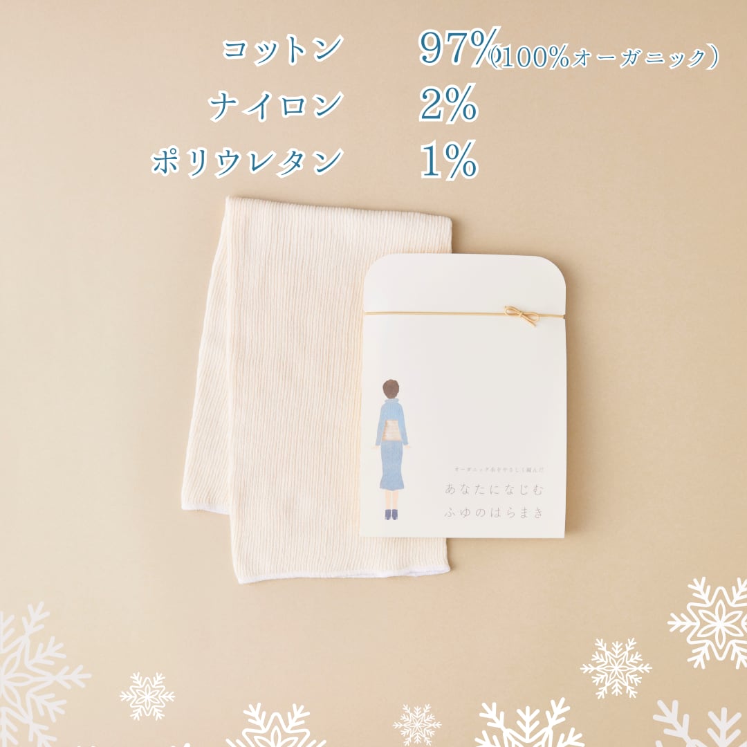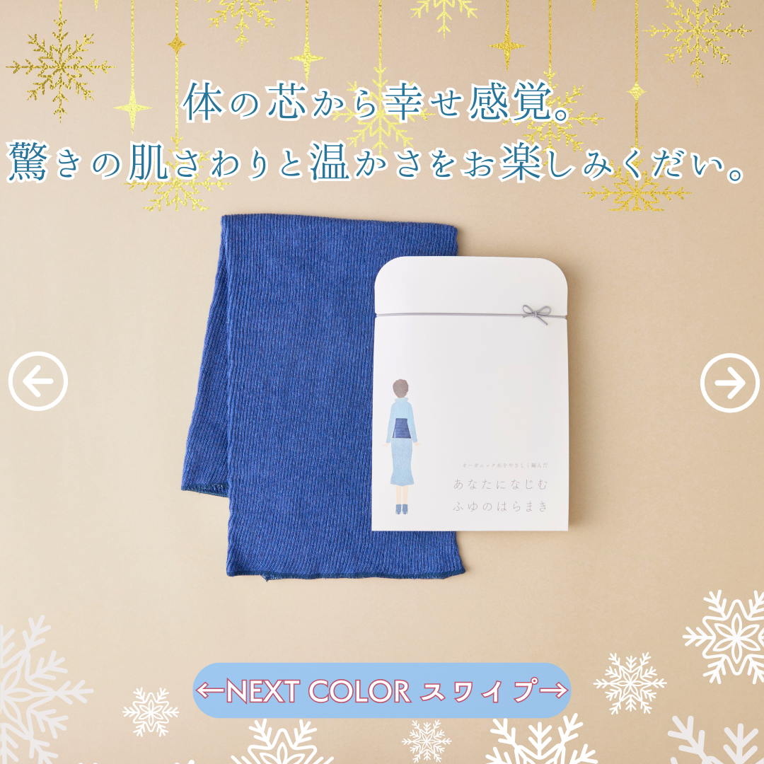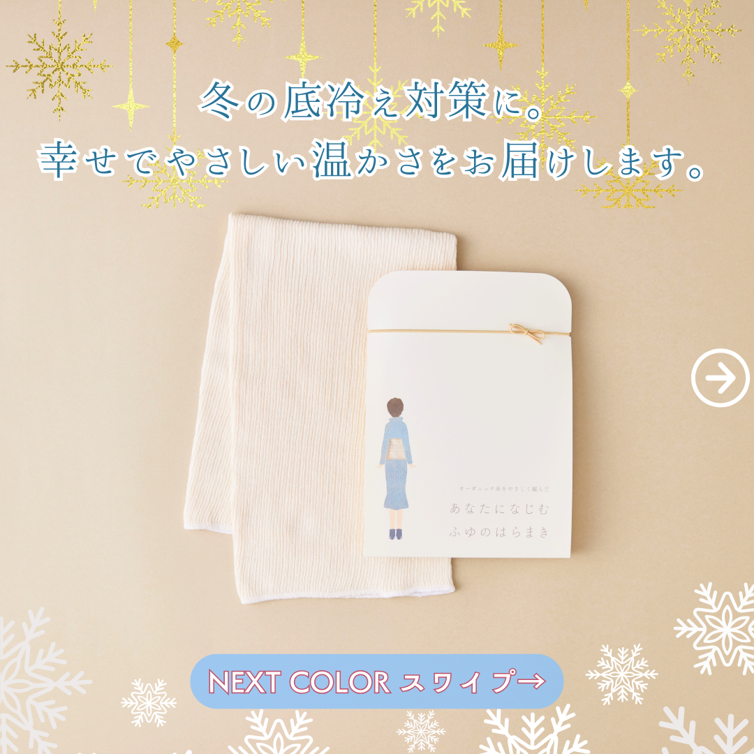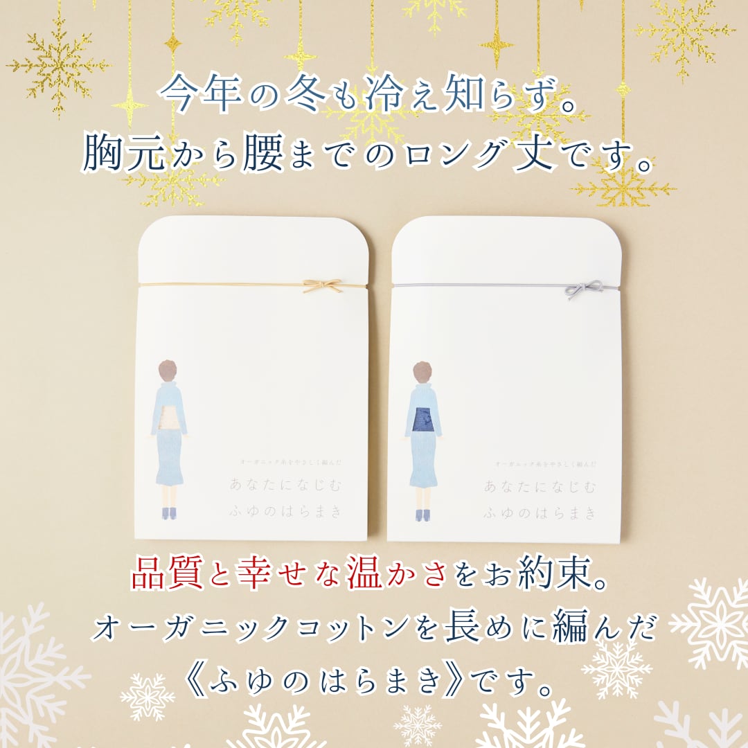 「今年の冬は冷え知らず。」オーガニックコットンを胸元から腰まですっぽり覆う『ロングタイプ』に編み込んだふゆのはらまきです。秋の終わりから真冬までの底冷えから、やさしい温かさと肌さわりで冷えた体をしっかりサポートします。シンプルな無地のはらまきのカラーは定番のきなりと冬限定デニムをご用意しています。