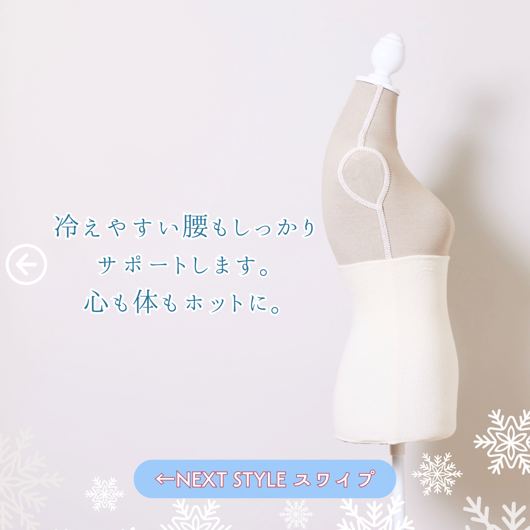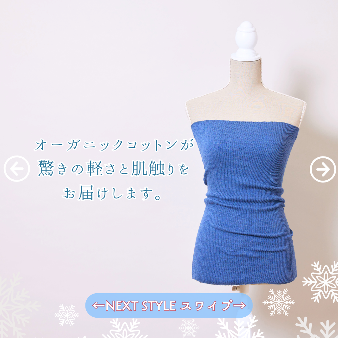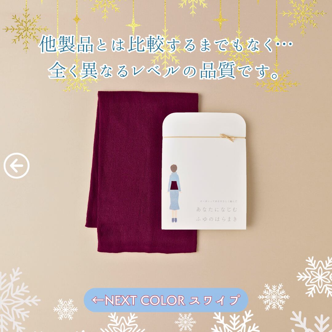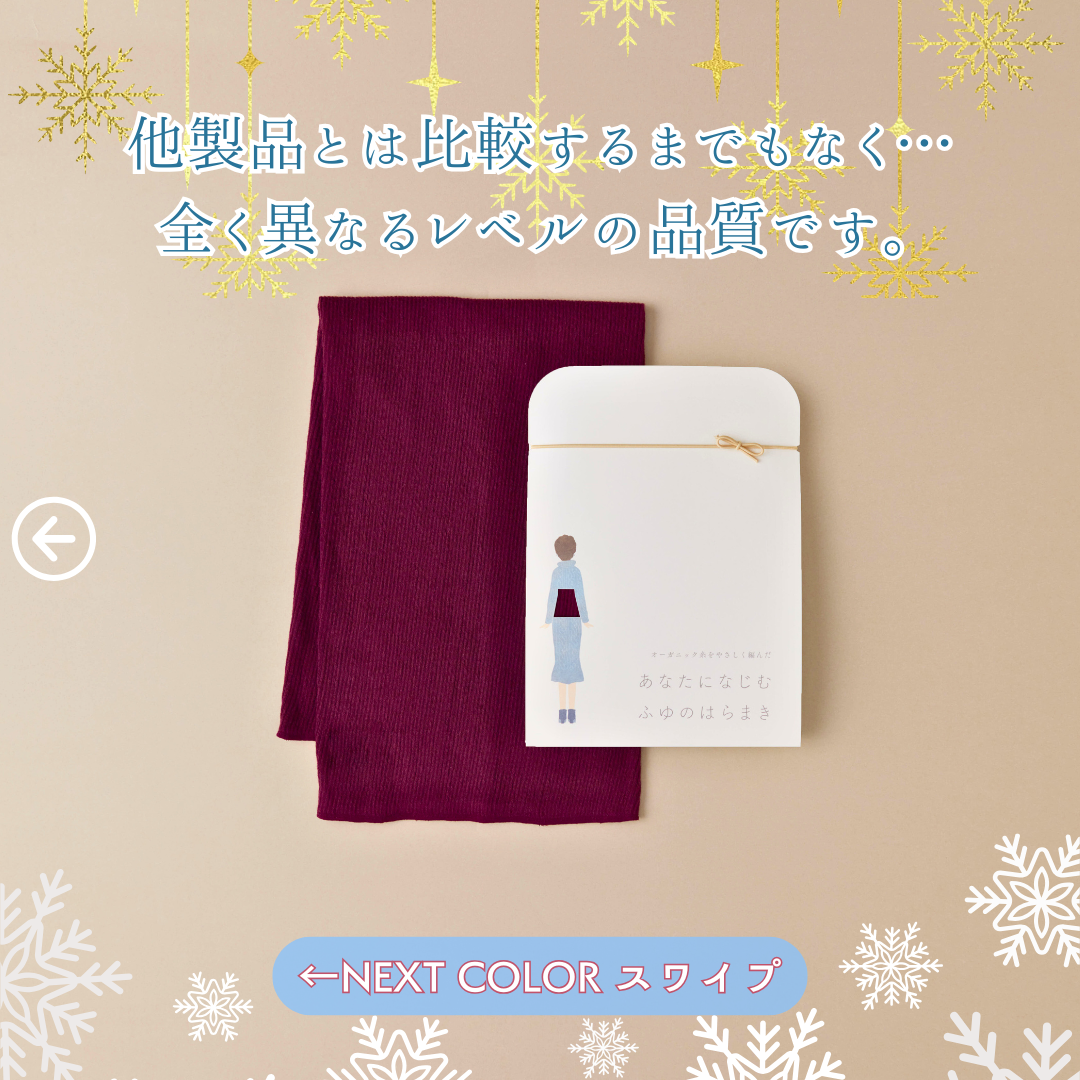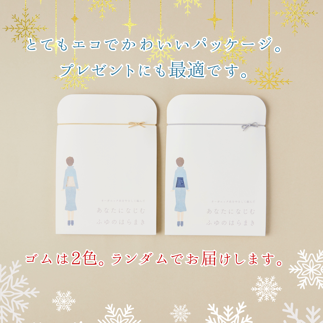 「今年の冬は冷え知らず。」オーガニックコットンを胸元から腰まですっぽり覆う『ロングタイプ』に編み込んだふゆのはらまきです。秋の終わりから真冬までの底冷えから、やさしい温かさと肌さわりで冷えた体をしっかりサポートします。シンプルな無地のはらまきのカラーは定番のきなりと冬限定デニムをご用意しています。
