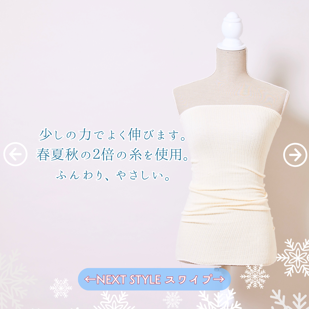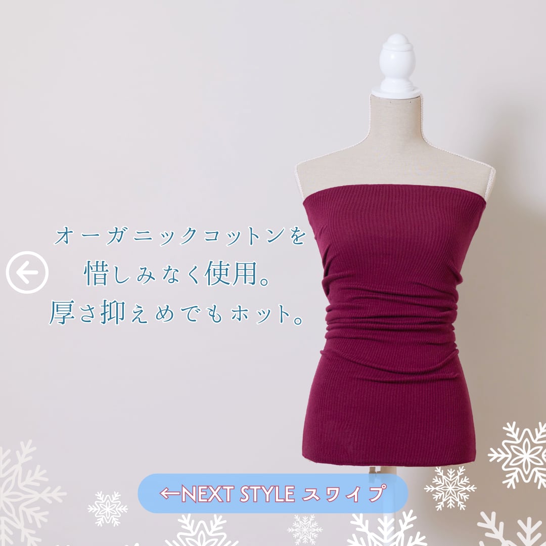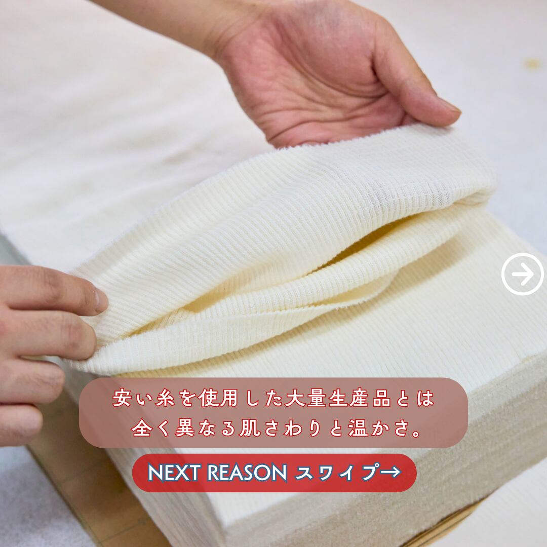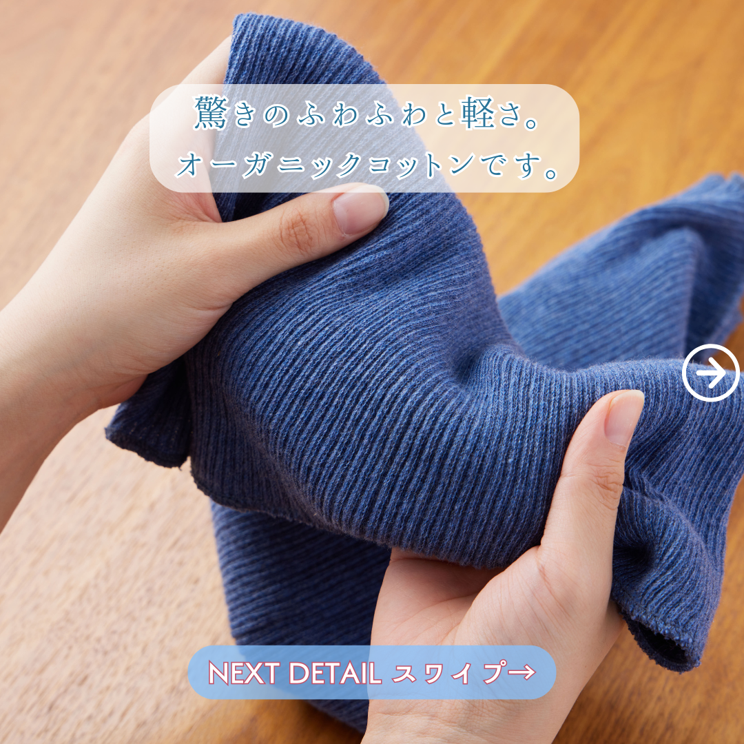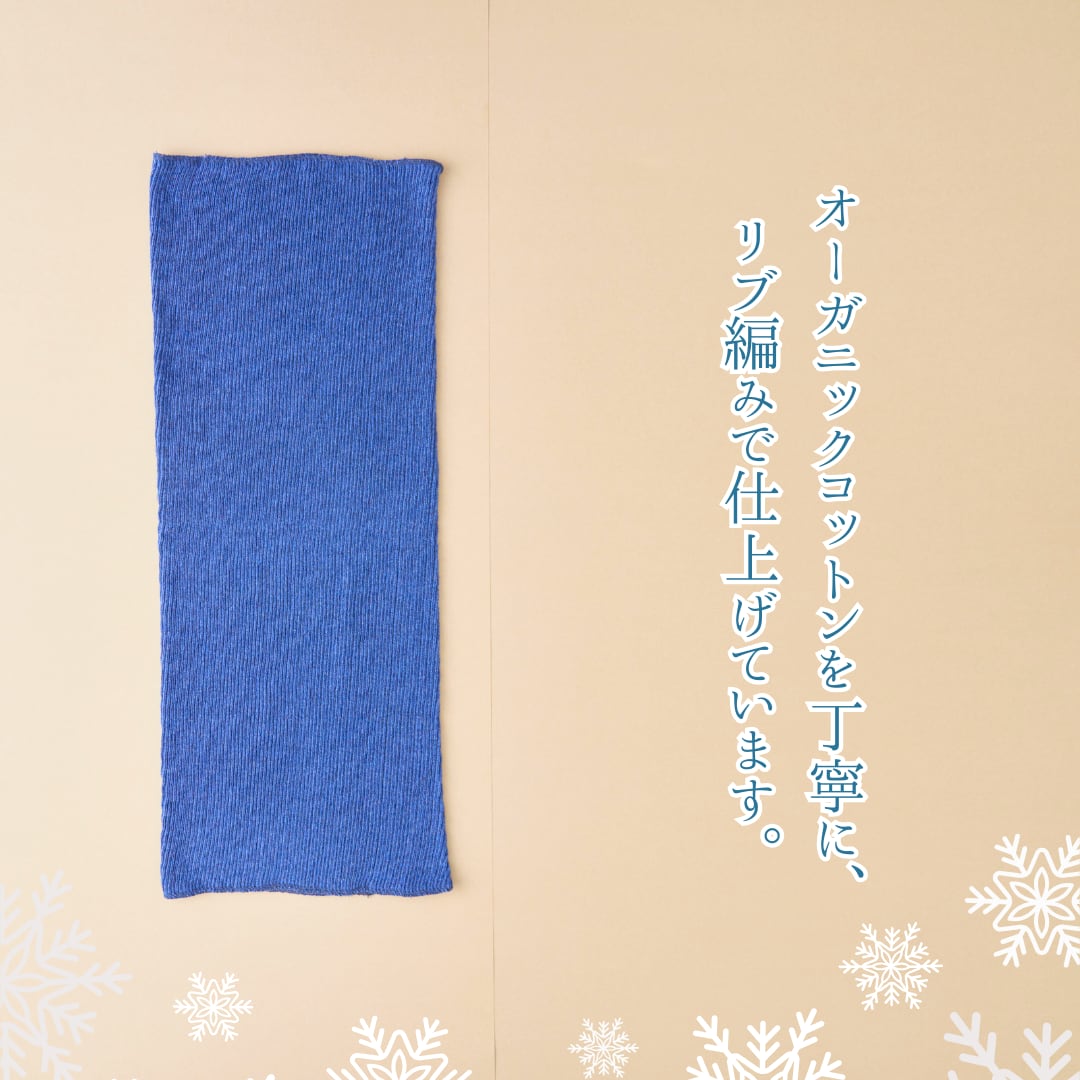 私たちプラスニドはゴワゴワしたふゆのはらまきは作りません。オーガニックコットンを高密度のリブ編みでうすめに。胸元から腰、お尻まですっぽり覆うロングタイプに仕上げました。