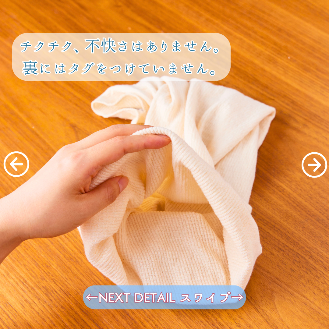 裏側にはタグもつけておりませんので、どの部分がお肌にあたっても、チクチクすることを極力避けています。やさしい肌さわりはもちろん、品があるシンプルデザインもお楽しみ下さい。
