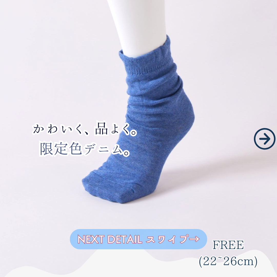 カバーソックスにはきなりともう一色、「デニム」をご用意しております。きなりのナチュラル感とはまたちがった「かわいさ」を兼ね備えたカラーとなっています。