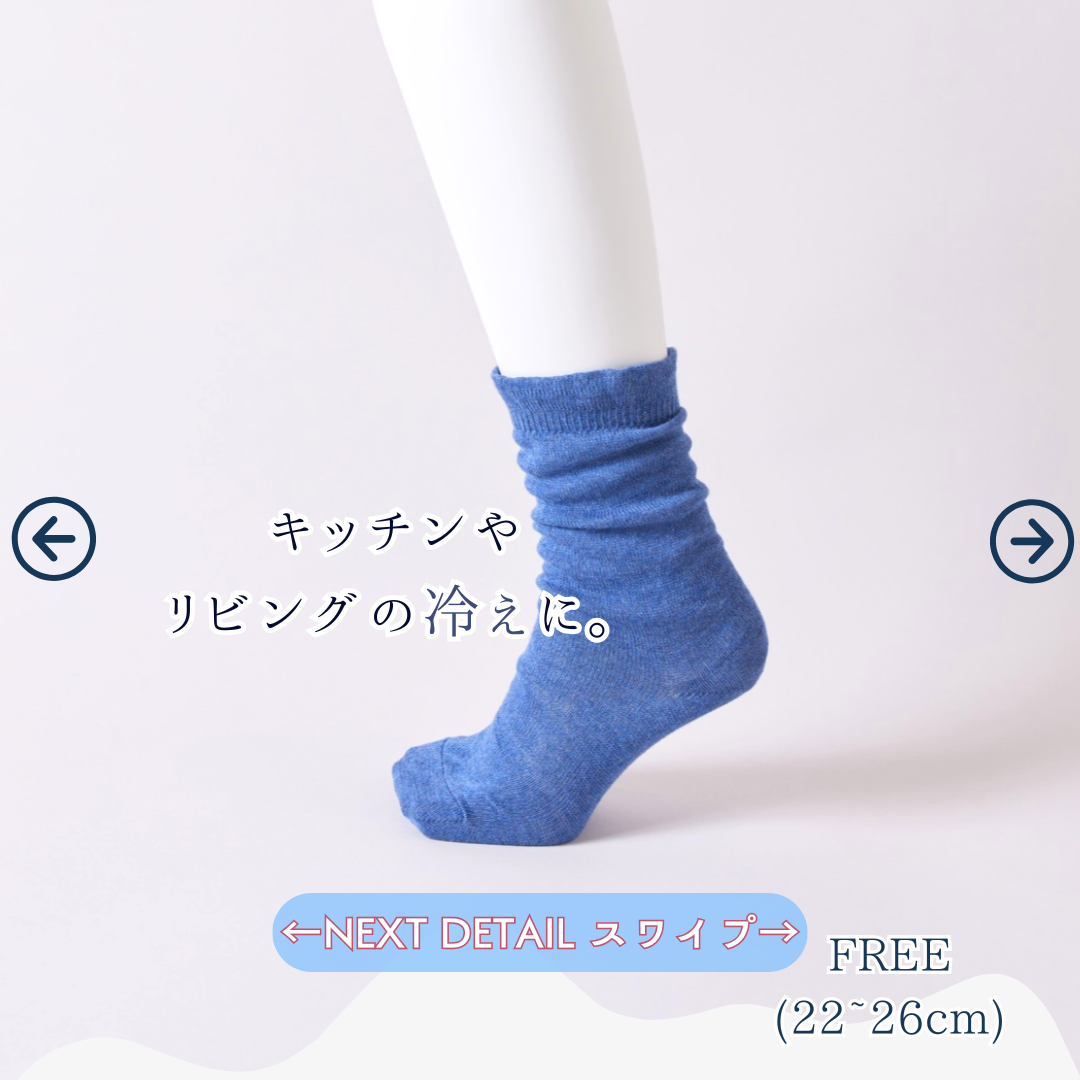 きなり、デニム共に細かい編みを繰り返しています。オーガニックコットンという柔らかき特性を十分に生かした重ね靴下で冷え対策をしていただければ幸いです。