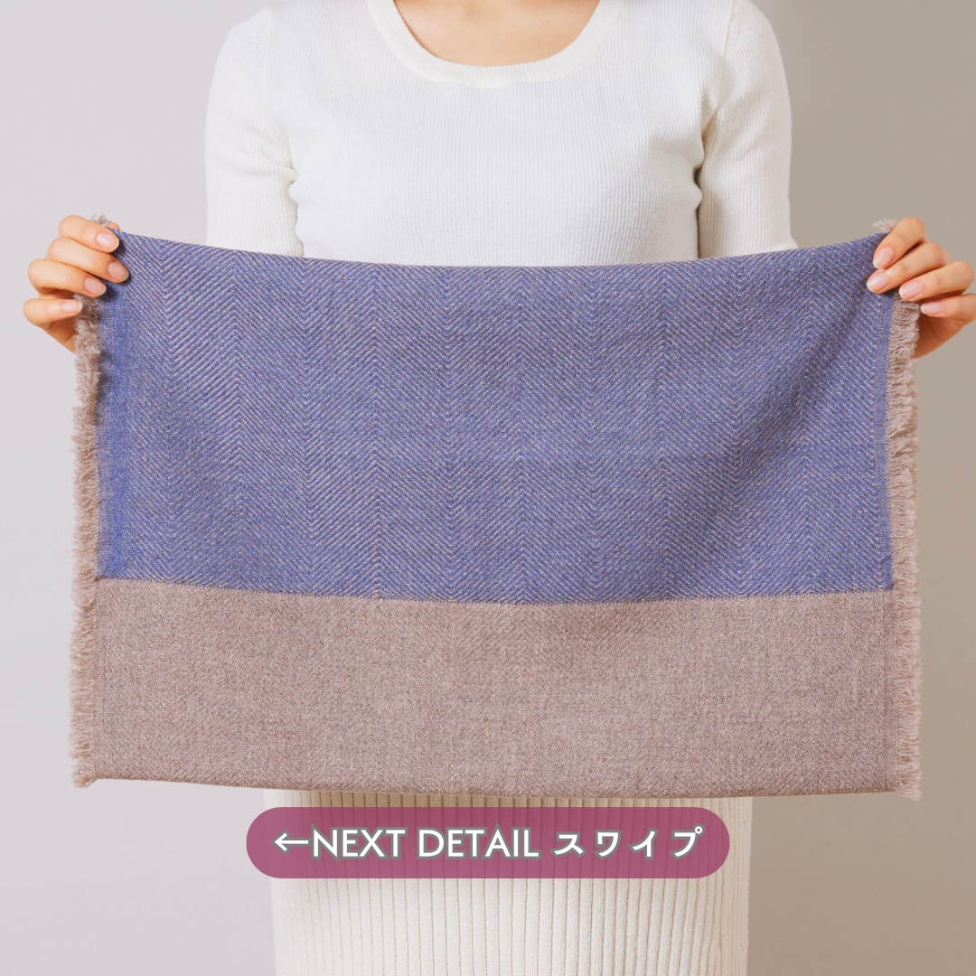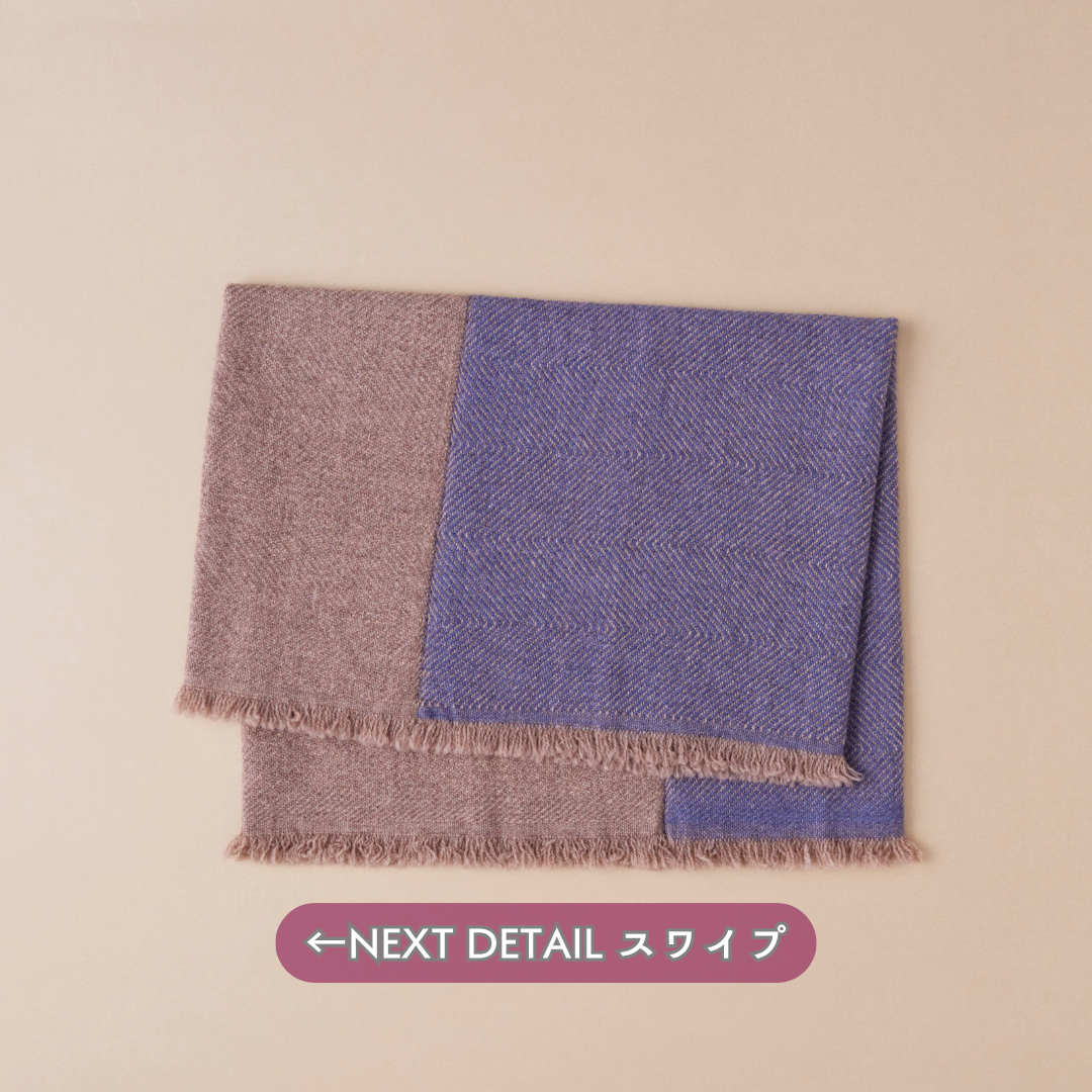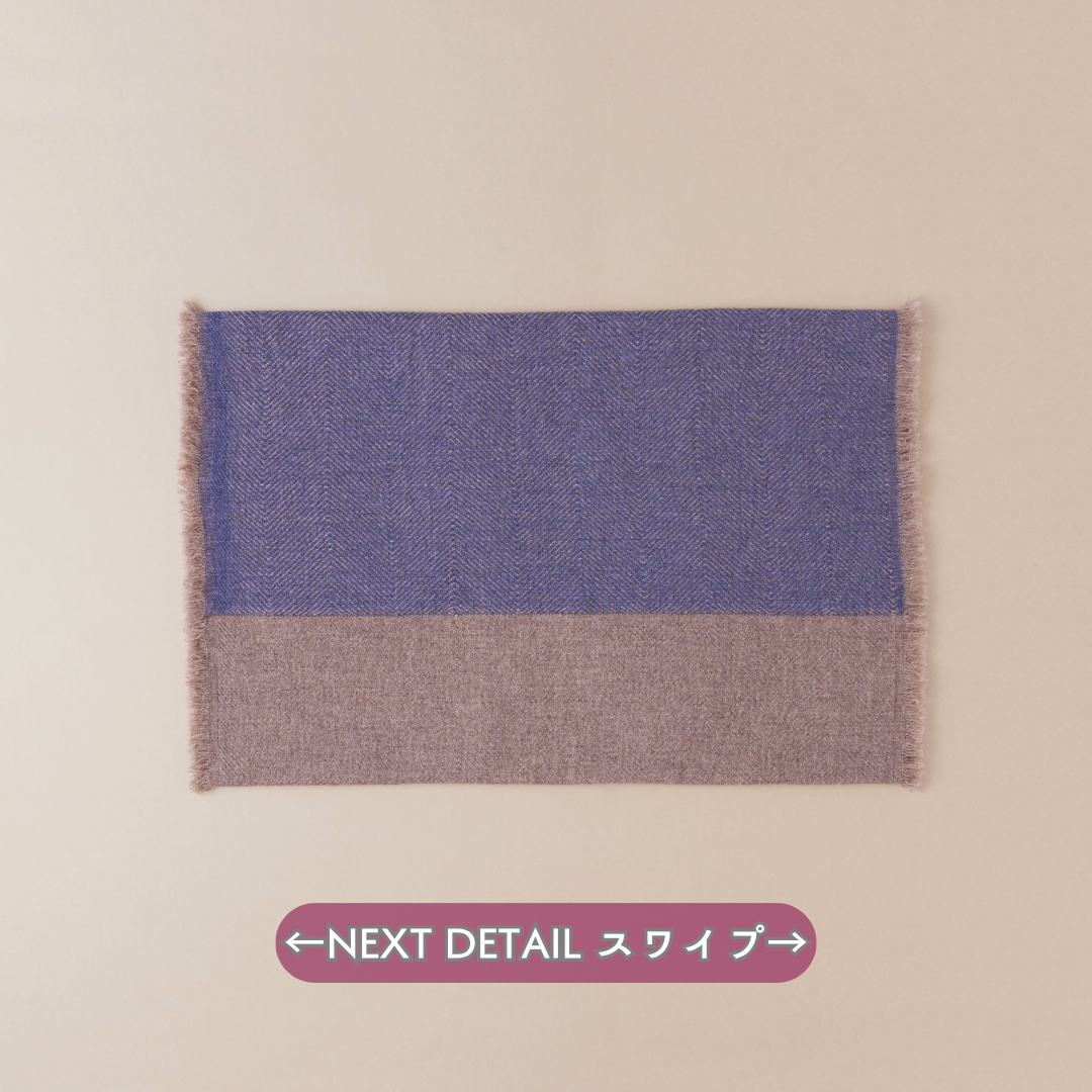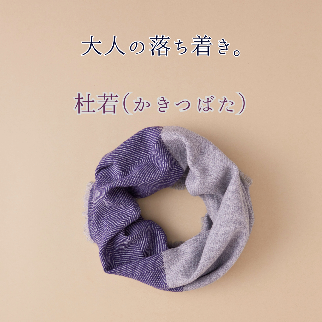 藍染色に少し紅色を混ぜた淡い紺色とブラウンのツートーンです。鮮やかすぎず秋冬らしく抑えめに。大人の穏やかさ感じる色合い。