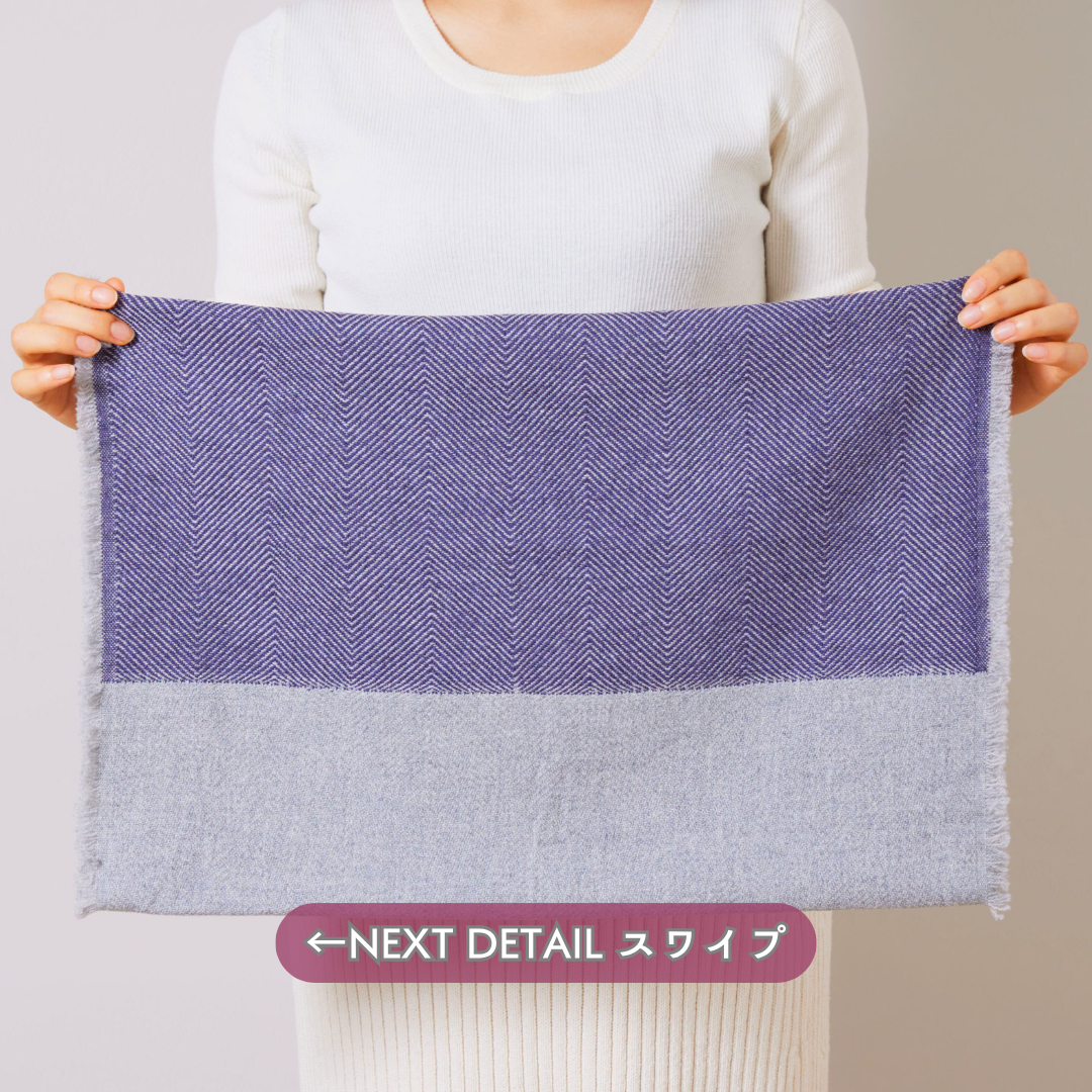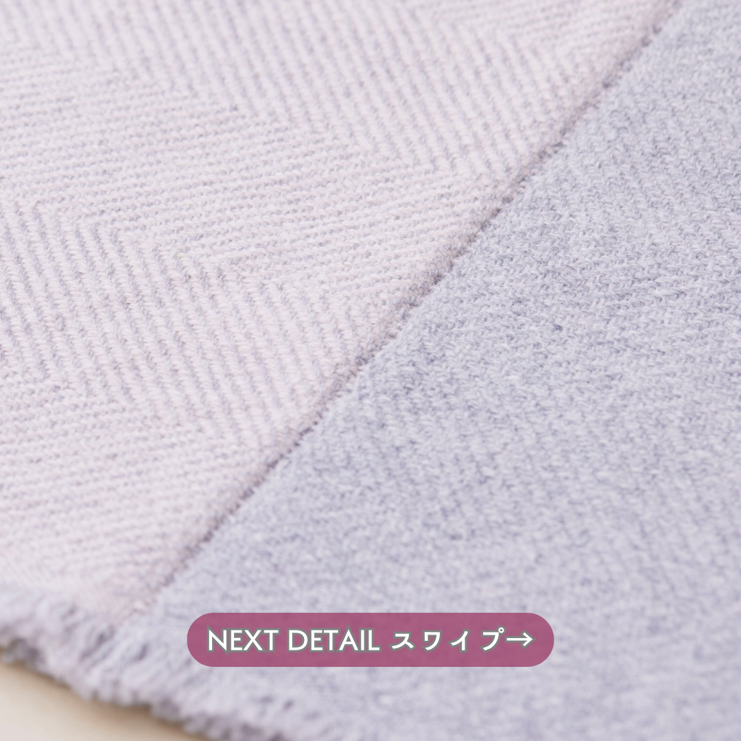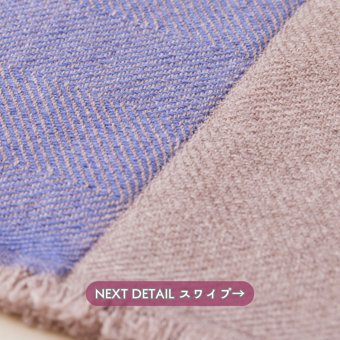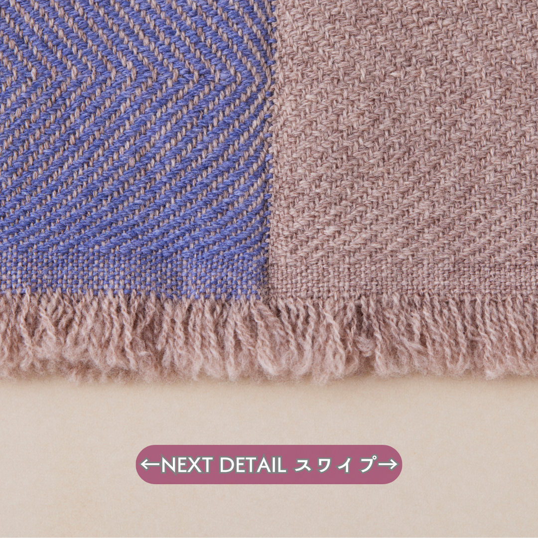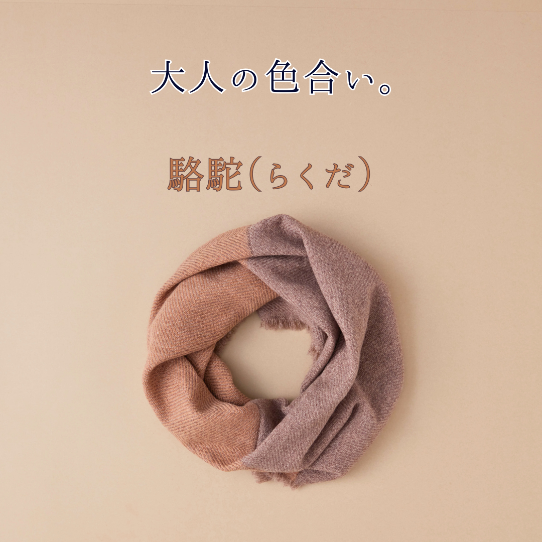 藍染色に少し紅色を混ぜた淡い紺色とブラウンのツートーンです。鮮やかすぎず秋冬らしく抑えめに。大人の穏やかさ感じる色合い。