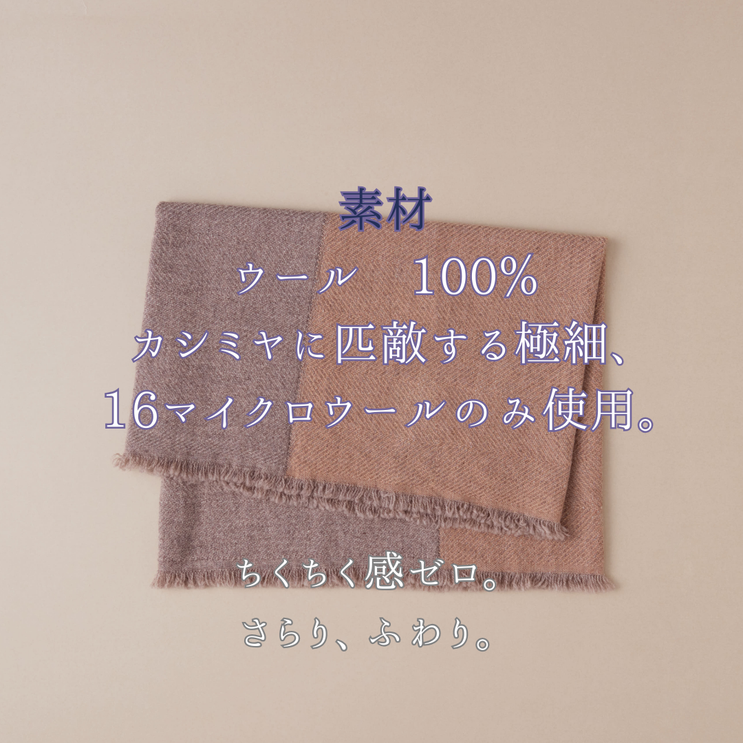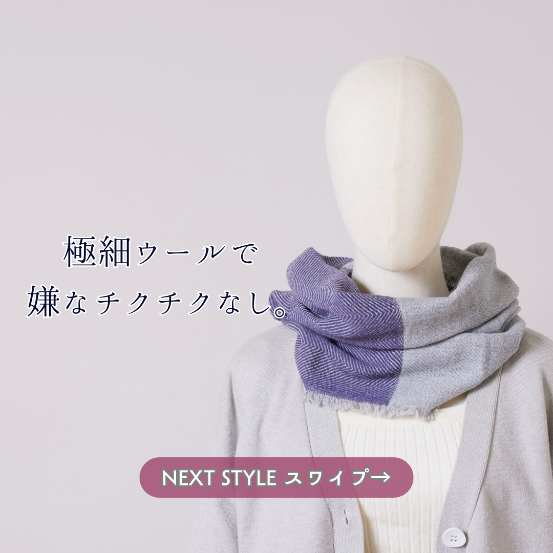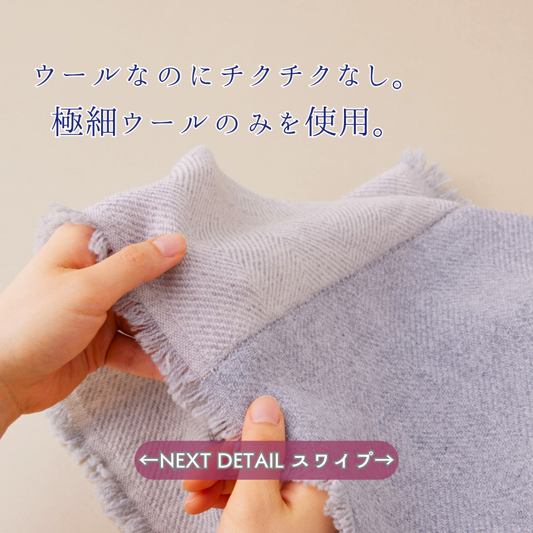 極細ウールをていねいに織り上げた、やわらかい肌さわりが特徴のスヌード。