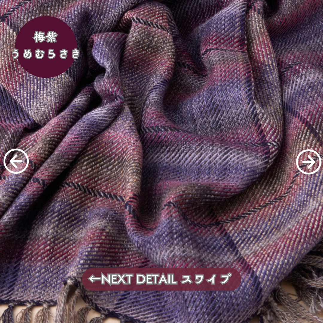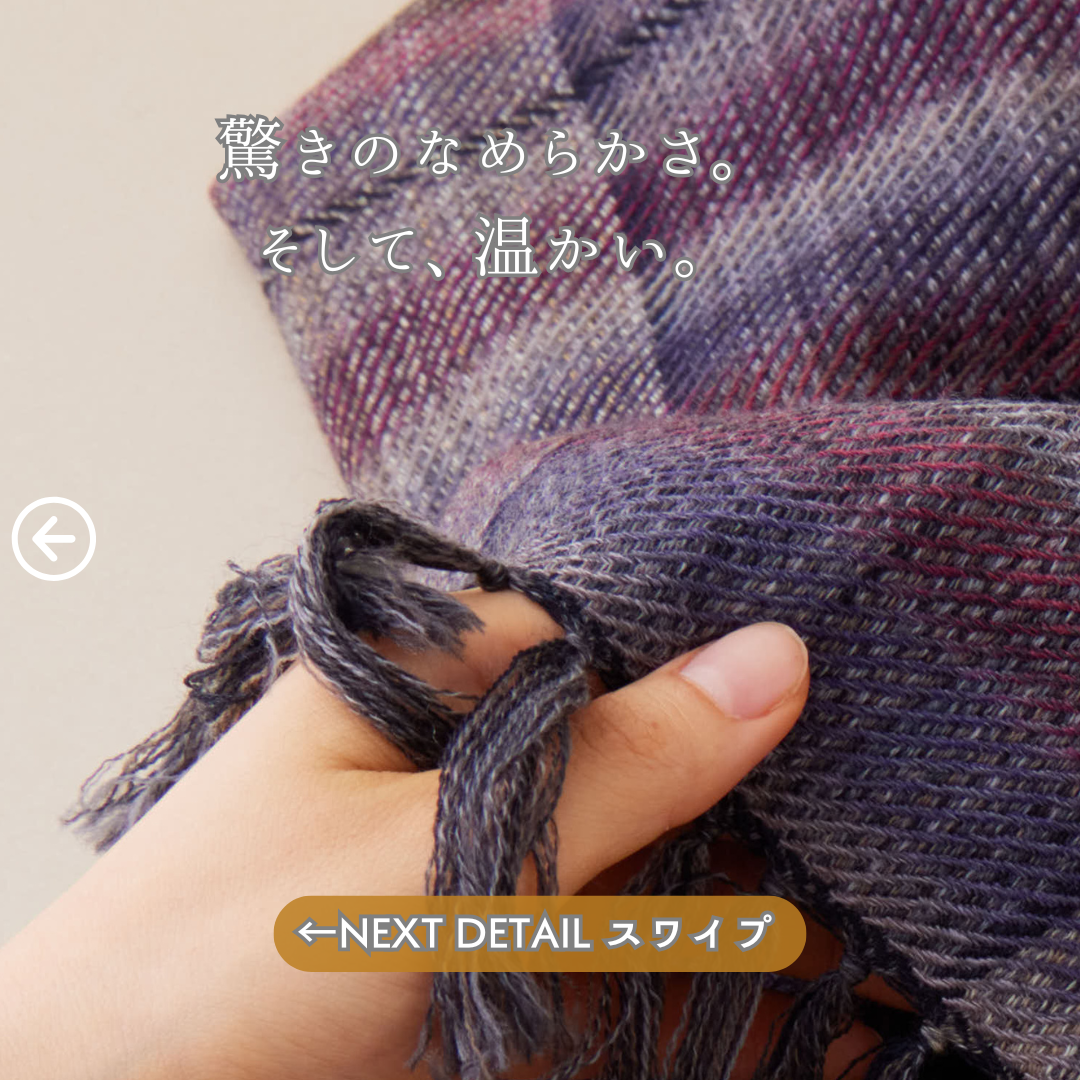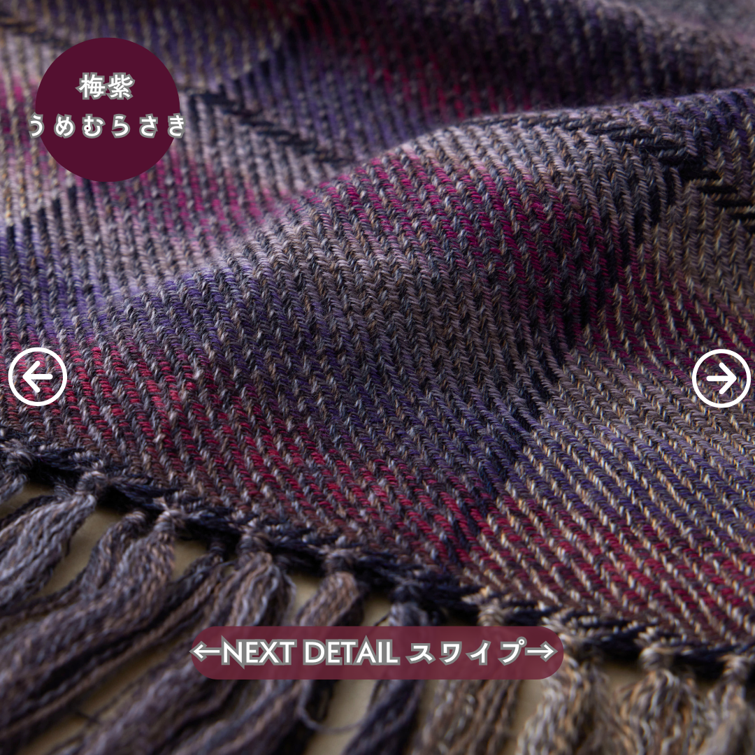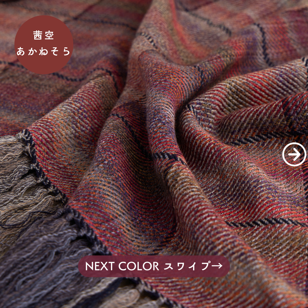 この世にたくさんのショールあれど、ウールでここまでなめらかなものはないと自信を持っております。そしてただ単に「単色の糸」を織り上げたものではなく、1本1本細かく染めた絣(かすり)染め糸を織り込んだグラデーション。