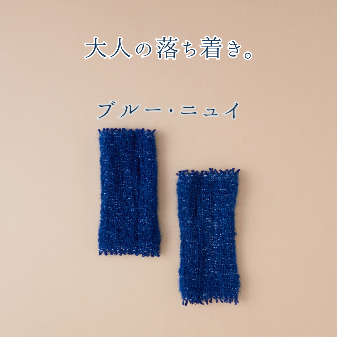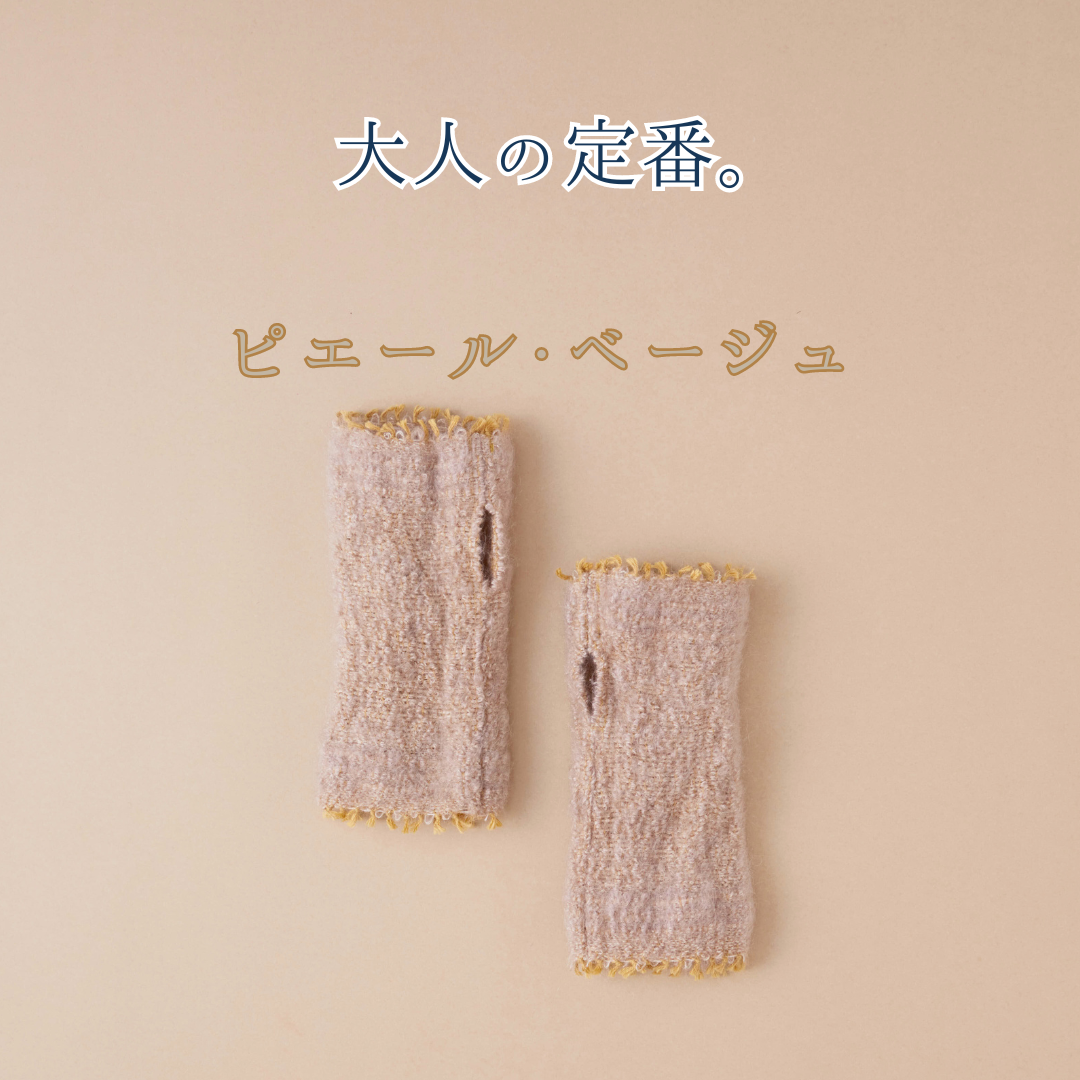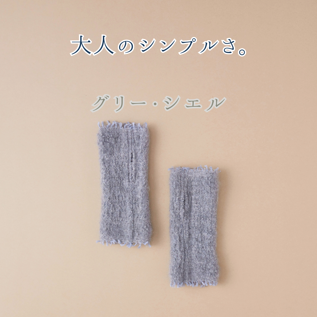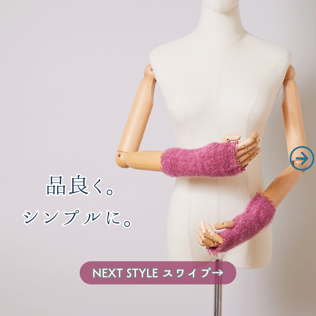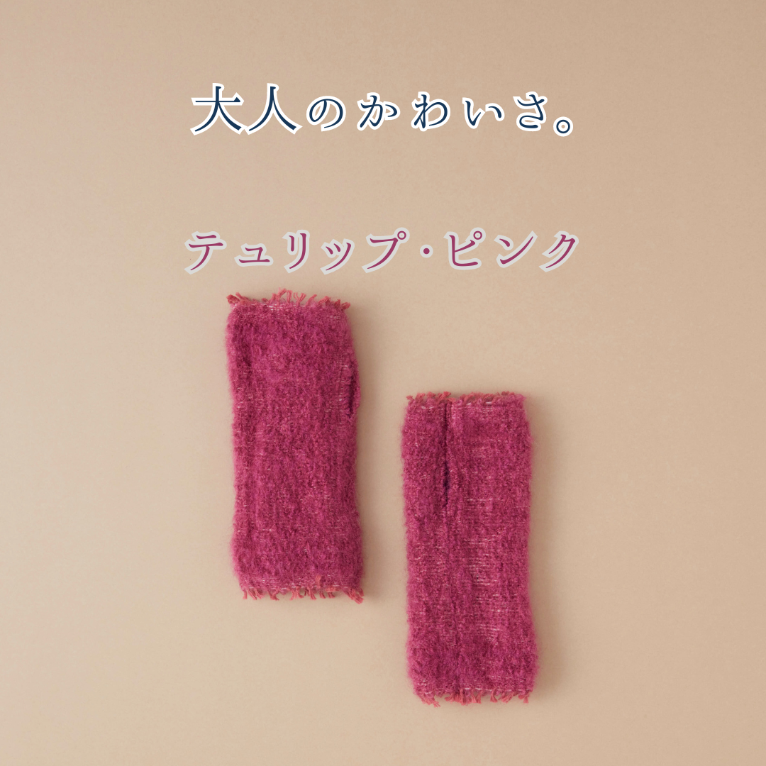 プラスニドのアームウォーアーは「モヘア」。選ばれし4色がフワッと、品よく、手先を彩ります。密着タイプのアームウォーマーが多い中、ふわりとした感覚で身につけられる軽さも魅力です。