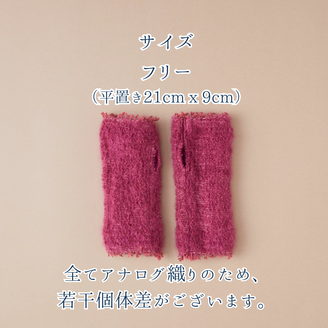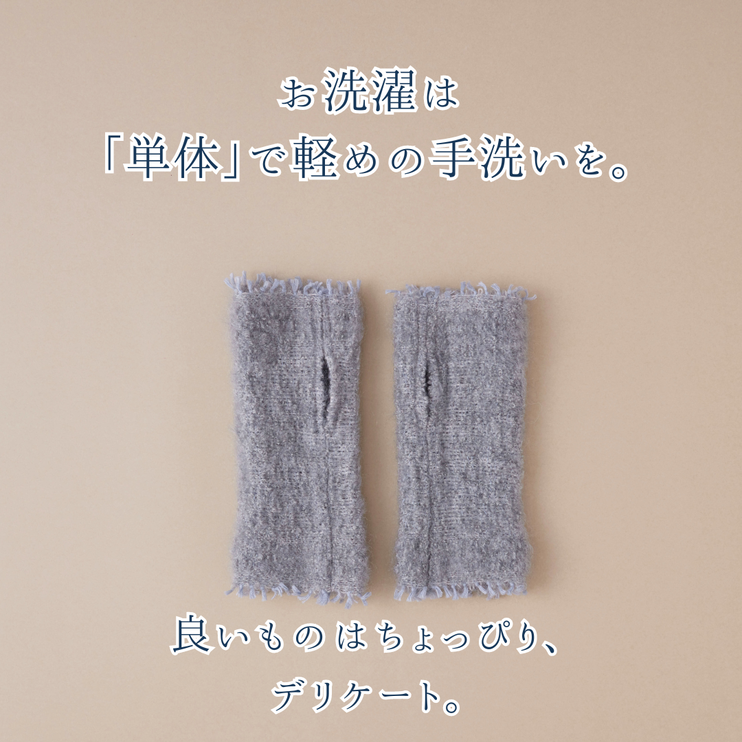 モヘアを「絡み織り」で織り上げたアームウォーマーです。品の良さが感じられ、なめらかでふんわりとした肌さわり。手首から手のひらまでを包み込む絶妙な長さで、冷えやすい部分をしっかりカバーします。