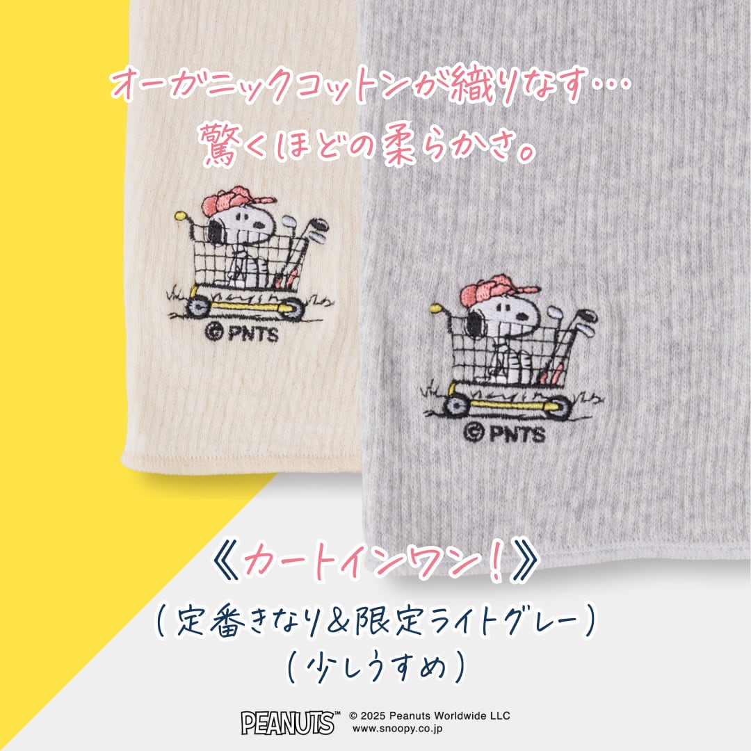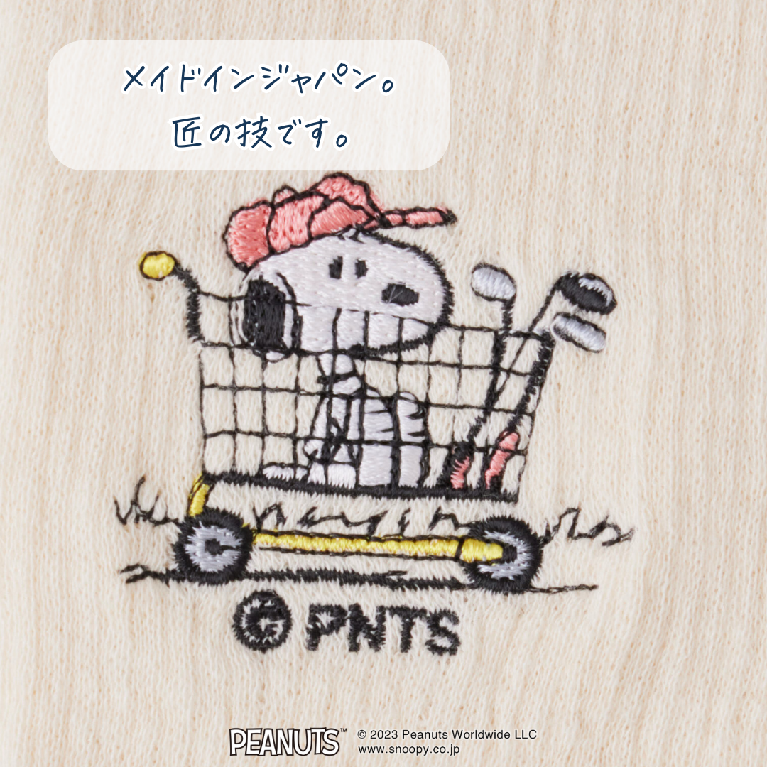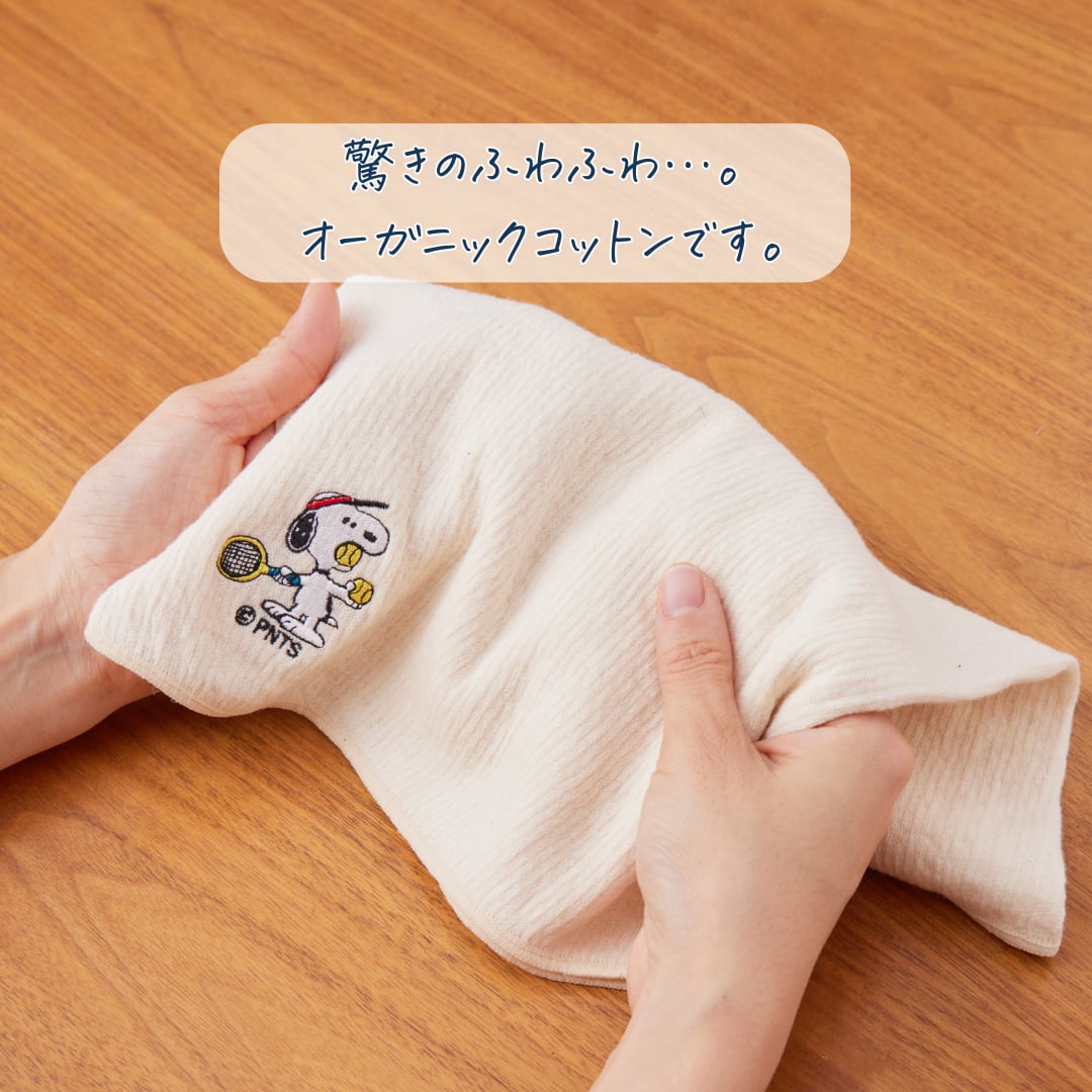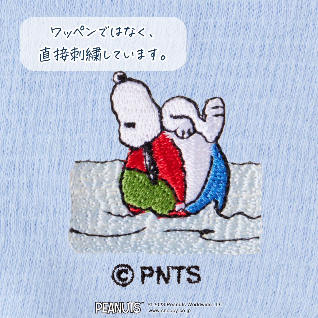 全世代に愛される「PEANUTSデザイン」刺繍を施すことにより「大人らしさ」と「可愛らしさ」の両立を実現。使用しているコットンは全てオーガニック。質が高い製品へと昇華させました。敏感肌でお悩みの方も安心していただけるよう、縫い目がない【丸編み】を採用しております。