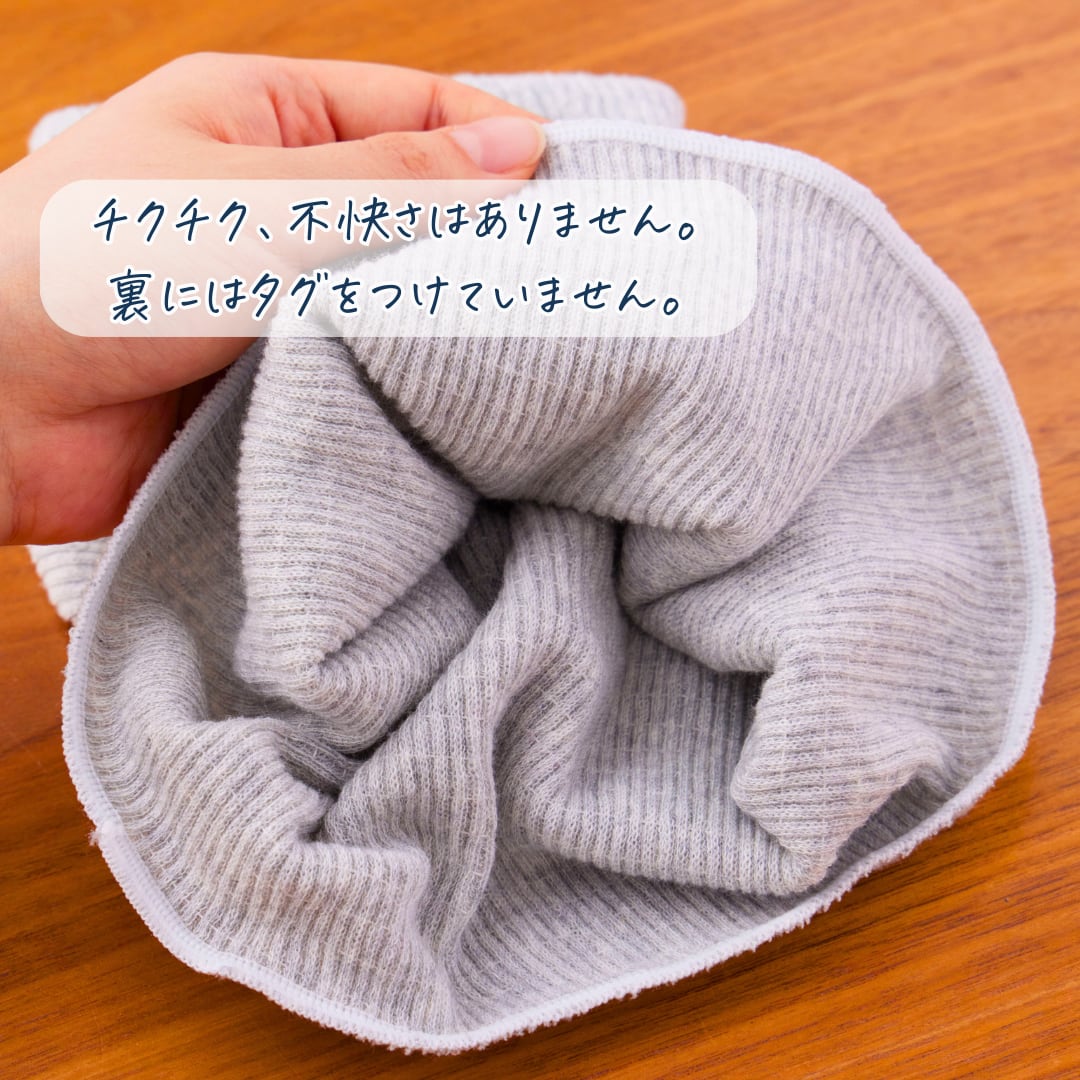 裏(内)側にはタグをつけておりませんので、どの部分がお肌にあたっても、チクチクすることはほぼありません。やさしい肌さわりはもちろん、品があるシンプルデザインも同時にお楽しみ下さい。